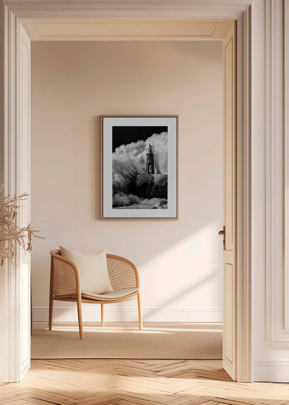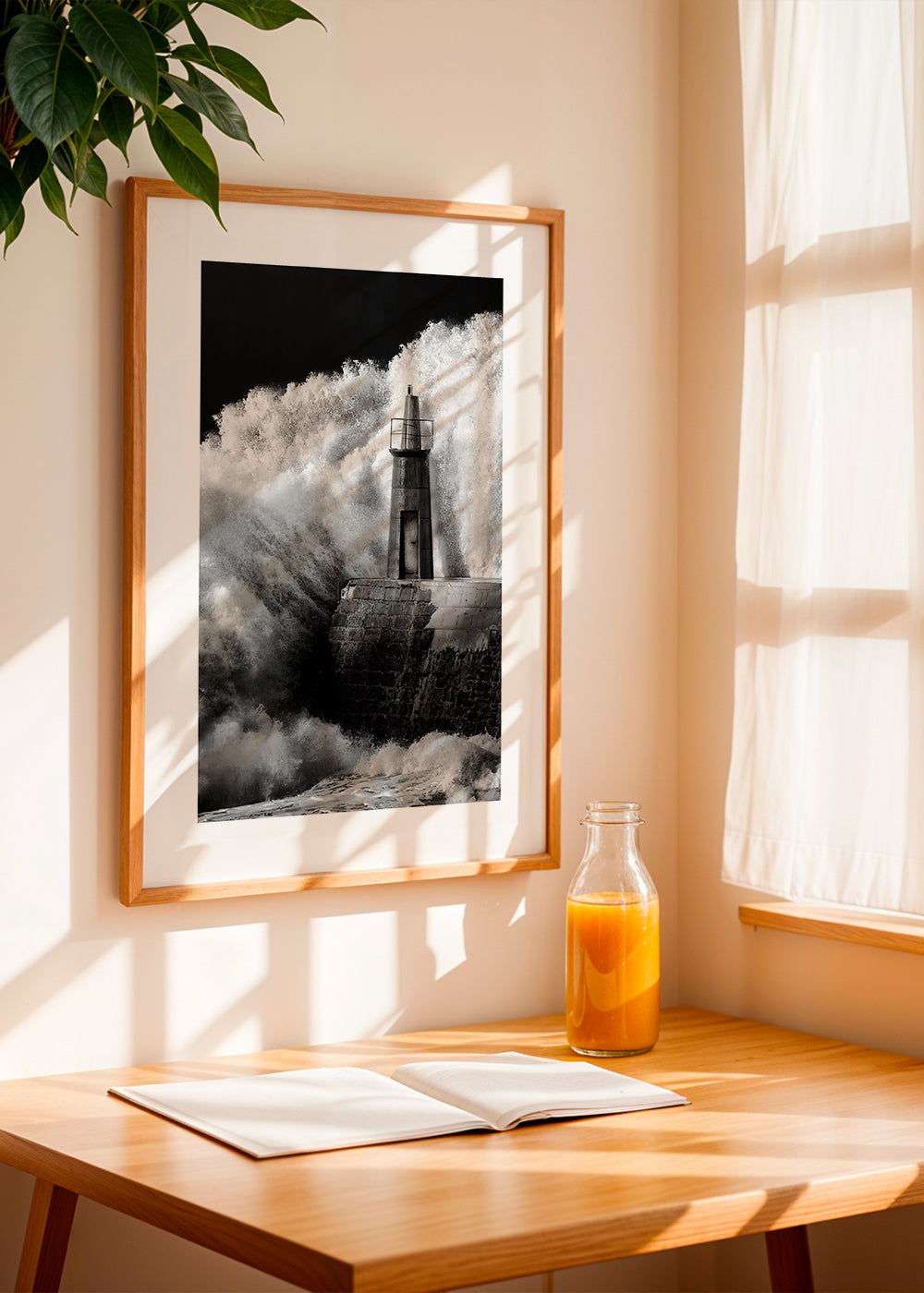A print inspired by the collection of ocean wall art and prints, with shades of black, and to hang in vertical position. Photography is an art form that can change any decoration. Adding photo prints to your interior design modernises any room. Dress up your walls at home This piece includes a white strip framing the design to boost its style.