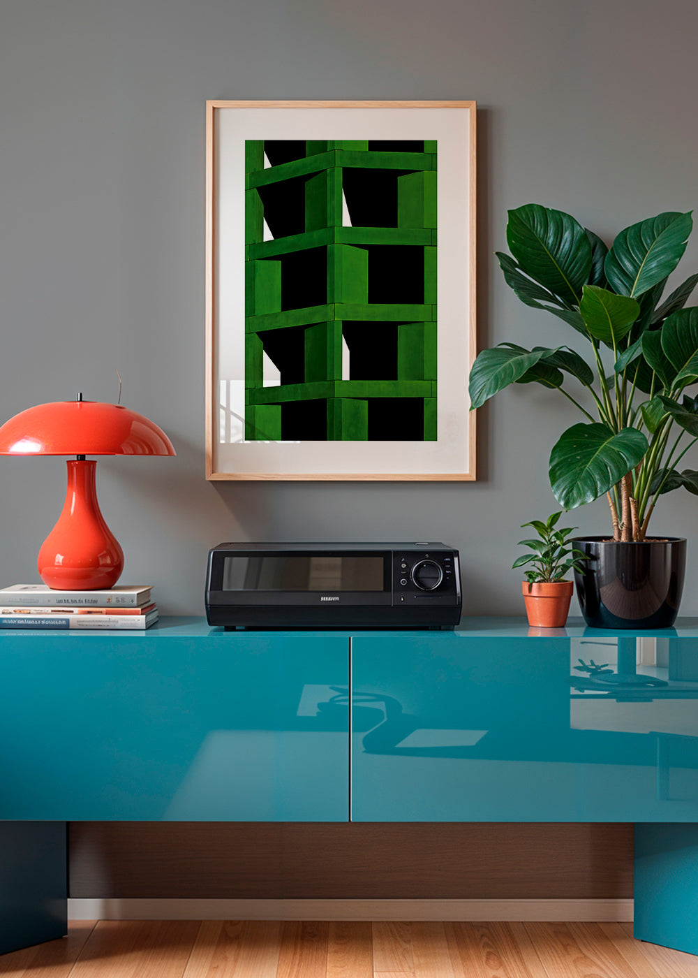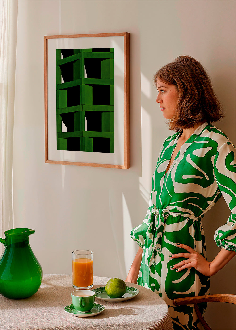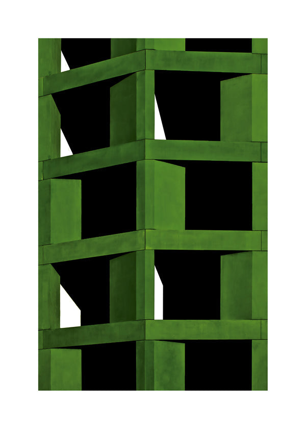 A print inspired by the collection of architecture wall art and prints, with green pigments, and with vertical layout. This piece with abstract shapes is perfect for pairing with other abstract art and geometric prints. Create the perfect wall decoration. The white strip around the piece enhances its expressiveness.