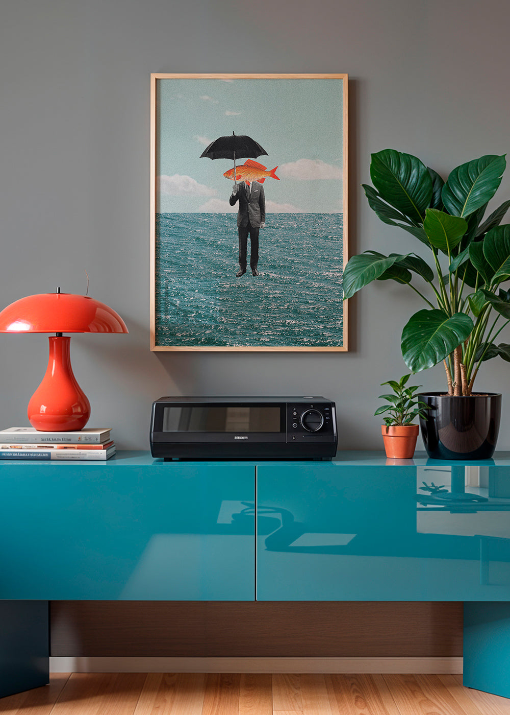 A poster from our selection of vintage wall art, from the mind of Maarten Léon, in tones of blue, and in vertical position. A retro style that is perfect for a vintage look. There are no ugly or beautiful walls, just empty or full ones.