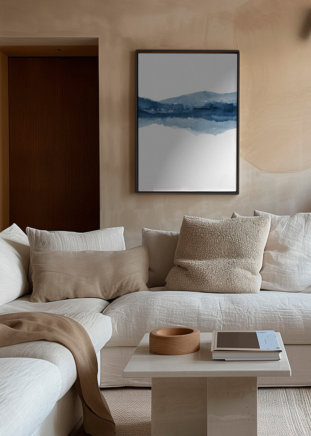 A poster from the landscape wall art series, made by Nouveau Prints, in tones of blue, and to hang in vertical position. A beautiful landscape perfect for pairing with other nature prints. Elegant walls for chic homes.