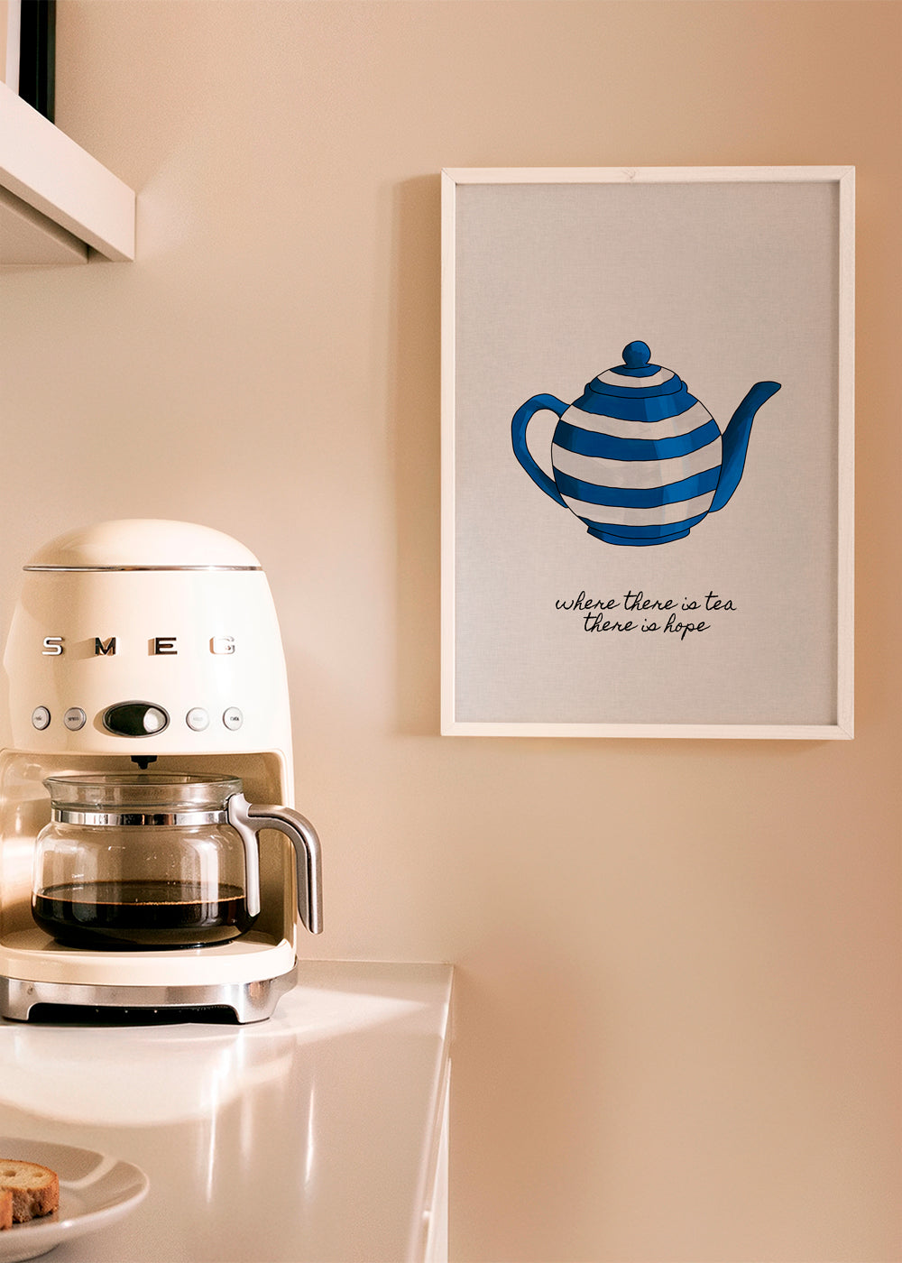 A poster from the coffee wall art category, created by Orara Studio, in tones of blue, and with vertical layout. The kitchen can be a cosy spot, too, if you pair this design with other kitchen prints for a super chic kitchen. Pure art and design.